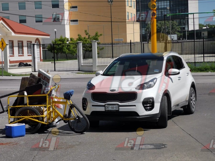 CAMPECHE.- Un hombre de aproximadamente 45 años de edad que transitaba por la avenida Santa Isabel en su triciclo de venta de comida fue arrollado por la conductora de una camioneta particular que no brindó el paso al ciclista; afortunadamente solo se registraron daños materiales pero no personas lesionadas por lo que la conductora decidió activar su seguro.