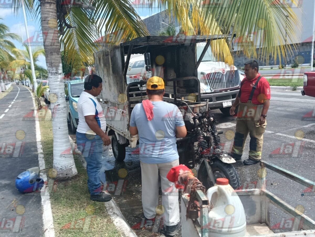 CAMPECHE.- Un motocarro Dinamo fue consumido por las llamas mientras circulaba por la avenida Pedro Sainz de Baranda, presuntamente debido a un corto circuito y una fuga de combustible. El incidente ocurrió minutos antes del mediodía, cuando el conductor percibió un fuerte olor a quemado seguido de un flamazo en la parte del motor.