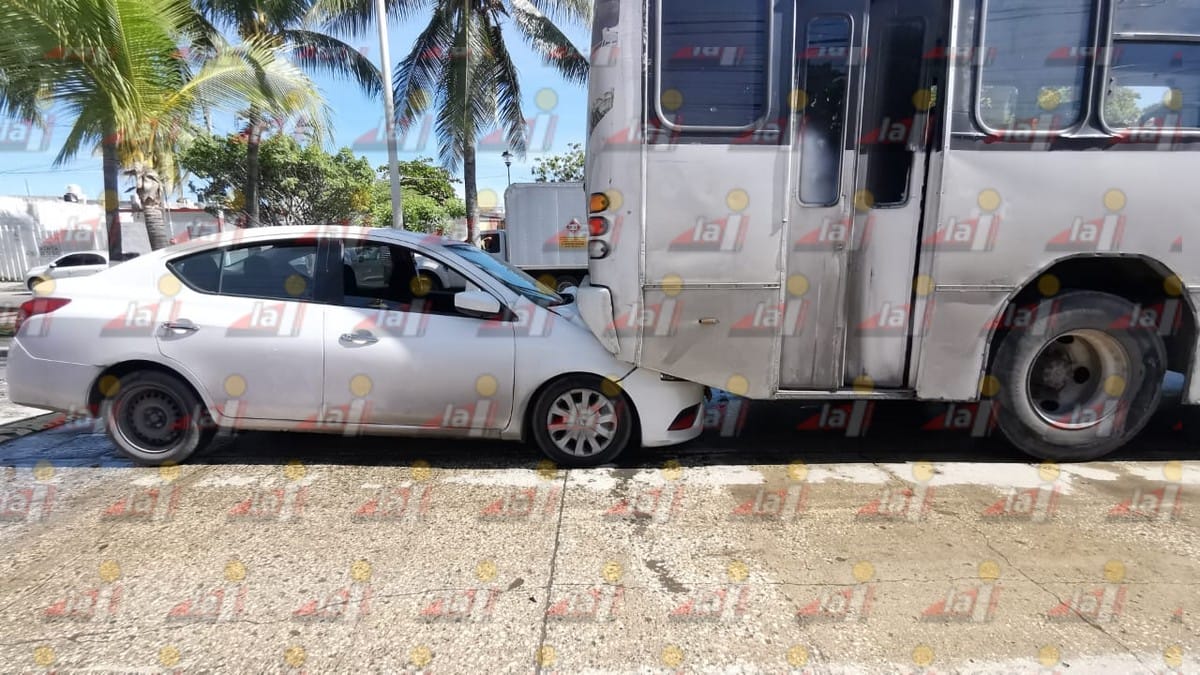 CIUDAD DEL CARMEN.-Por no guardar la debida distancia la conductora de un vehículo particular protagonizó un aparatoso choque por alcance en la avenida Periférica Norte; dejando todo el frente de su vehículo incrustado en la parte trasera de un camión urbano de la ruta Periférico, afortunadamente no se registraron personas lesionadas pero si daños mayores.
