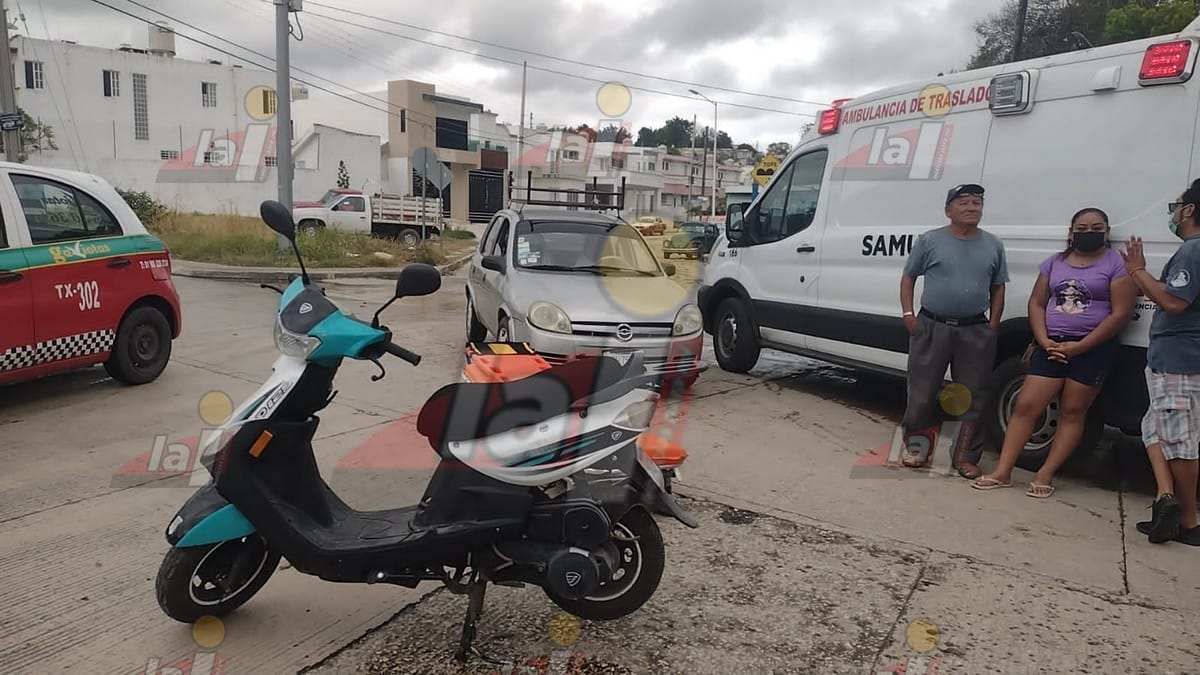 Fue en el cruce con la calle 108, cuando el guiador del Chevy al frenar sobre el pavimento mojado derivado de la lluvia, la unidad motriz patino originando que impactara casi de frente al conductor de la motocicleta marca Italika tipo motoneta en color azul y placas 49CSW4 del estado, quien se desplazaba en preferencia y con dirección hacia la colonia Bellavista, por lo que poco pudo hacer para evitar el percance.