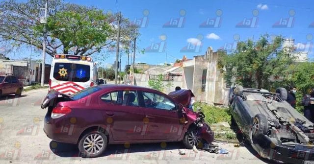 MÉRIDA.- La mañana de este viernes se registró un aparatoso accidente en calles de Juan Pablo II, dejando un automóvil volcado y otro con el frente destrozado.