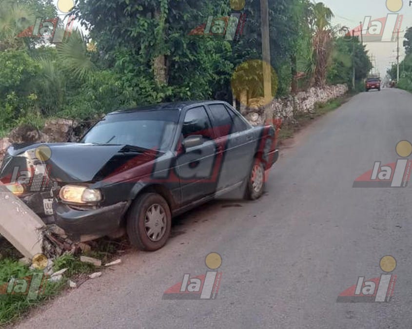 OXKUTZCAB.-El conductor de un Tsuru presuntamente ebrio abandonó su vehículo luego de chocarlo contra un poste de la CFE. El percance dejó cuantioso daños materiales y la zona de los hechos sin el servicio de energía eléctrica.