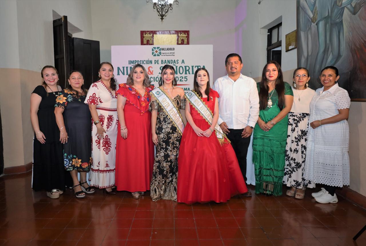Valladolid.- El presidente municipal, Homero Novelo Burgos, y la presidenta del DIF Valladolid, María Teresa Martín López, presentaron e impusieron las bandas anoche a la Señorita y a la Niña Revolución 2025, Karim Jetzai Aban Tuyu y Eleonor Sánchez Pinto, respectivamente, durante un evento que se realizó en el salón de los murales del Palacio Municipal.