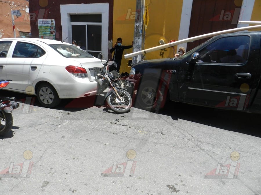MOTUL.-Una motocicleta quedó prensada entre dos vehículos luego que un conductor se quedó sin frenos y no logró detenerse ante la fila de unidades que hacían alto en el semáforo.