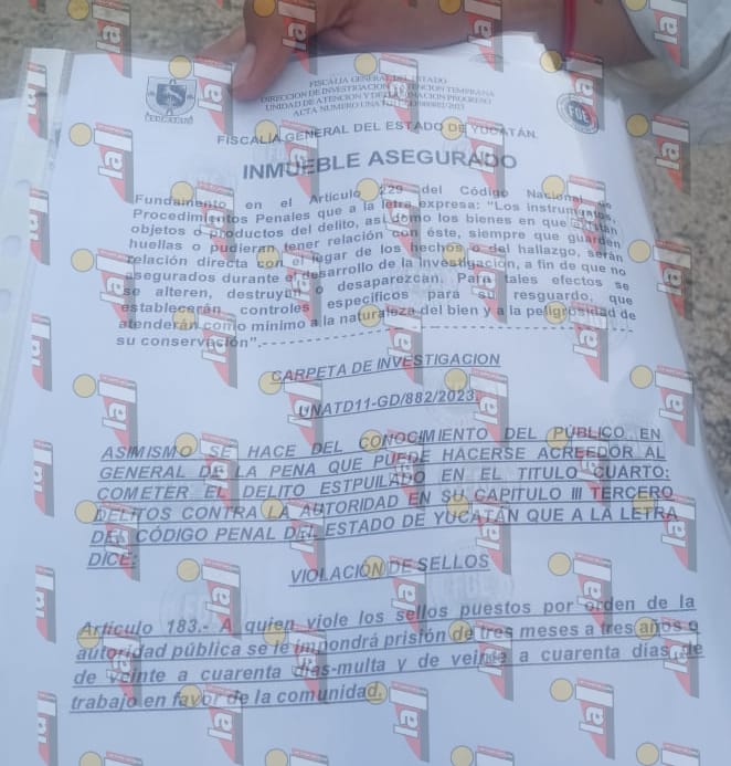 Desde las cuatro de la mañana llegaron unidades de la Secretaría de Seguridad Pública de Yucatán (SSP) a custodiar el área, que al parecer es propiedad de reconocidas familias yucatecas. Además, los uniformados colocaron documentos de la Fiscalía General del Estado (FGE), que señalan que el inmueble se encuentra asegurado y advierte sobre las sanciones que podrían recibir las personas que violen dichas disposiciones.