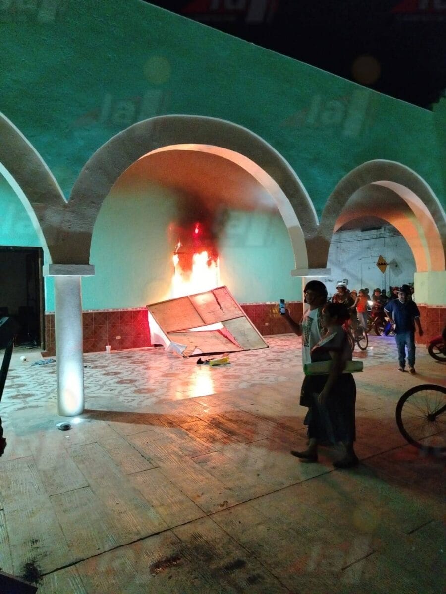 TZUCACAB.- Incendian palacio en Tzucacab tras una protesta de vecinos que exigían justicia por la muerte de Ángel A. Ch., un hombre detenido la noche del lunes y encontrado sin vida al amanecer en la cárcel municipal. Lo que comenzó como una manifestación pacífica se salió de control y los manifestantes realizaron quemas y destrozos dentro y fuera del Palacio Municipal, causando serios daños a la infraestructura y a mobiliario público.