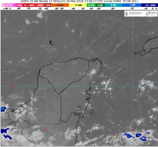 El pronóstico indica que el lunes 30 de marzo, la entrada de aire marítimo tropical provocará nublados dispersos y lluvias moderadas en el sur y norte de Quintana Roo, así como en el centro, sur y oriente de Yucatán; Campeche registrará lluvias fuertes en el norte y suroeste.
