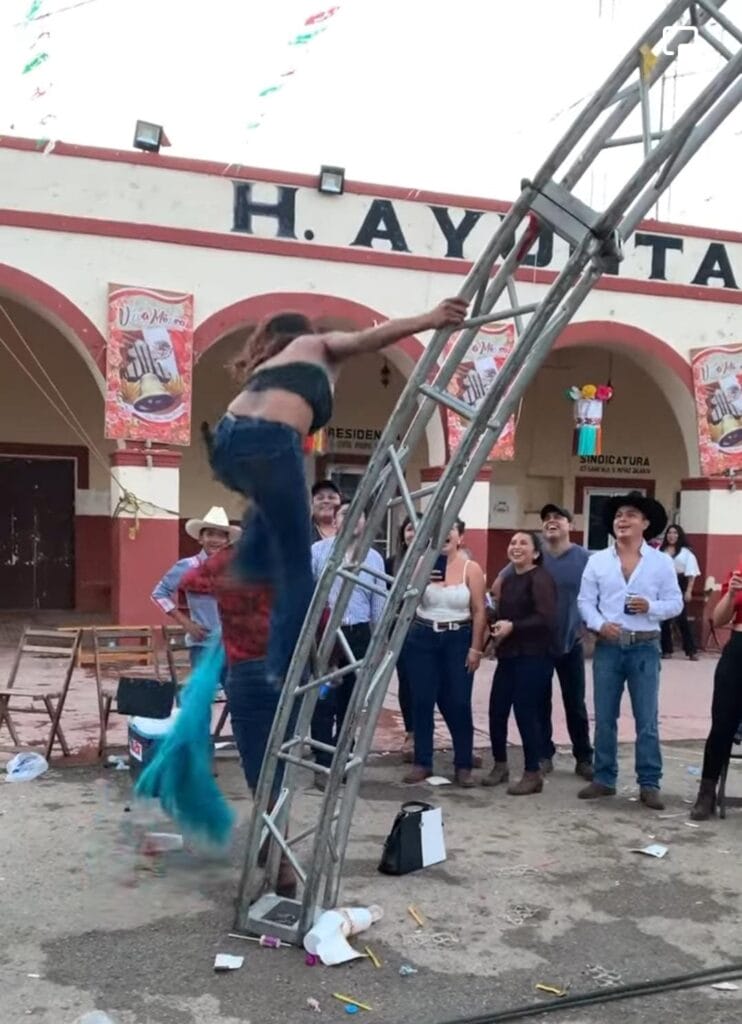 En la publicación se puede observar, en un primer momento, que una mujer con jeans, botas y camisa roja bailaba en el centro de un círculo de personas, que la apoyaban para que siguiera bailando. Incluso, en un momento se subió a una estructura de luces de una tarima para continuar su presentación.
